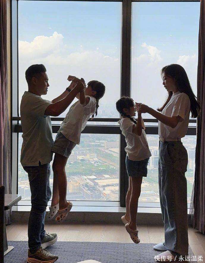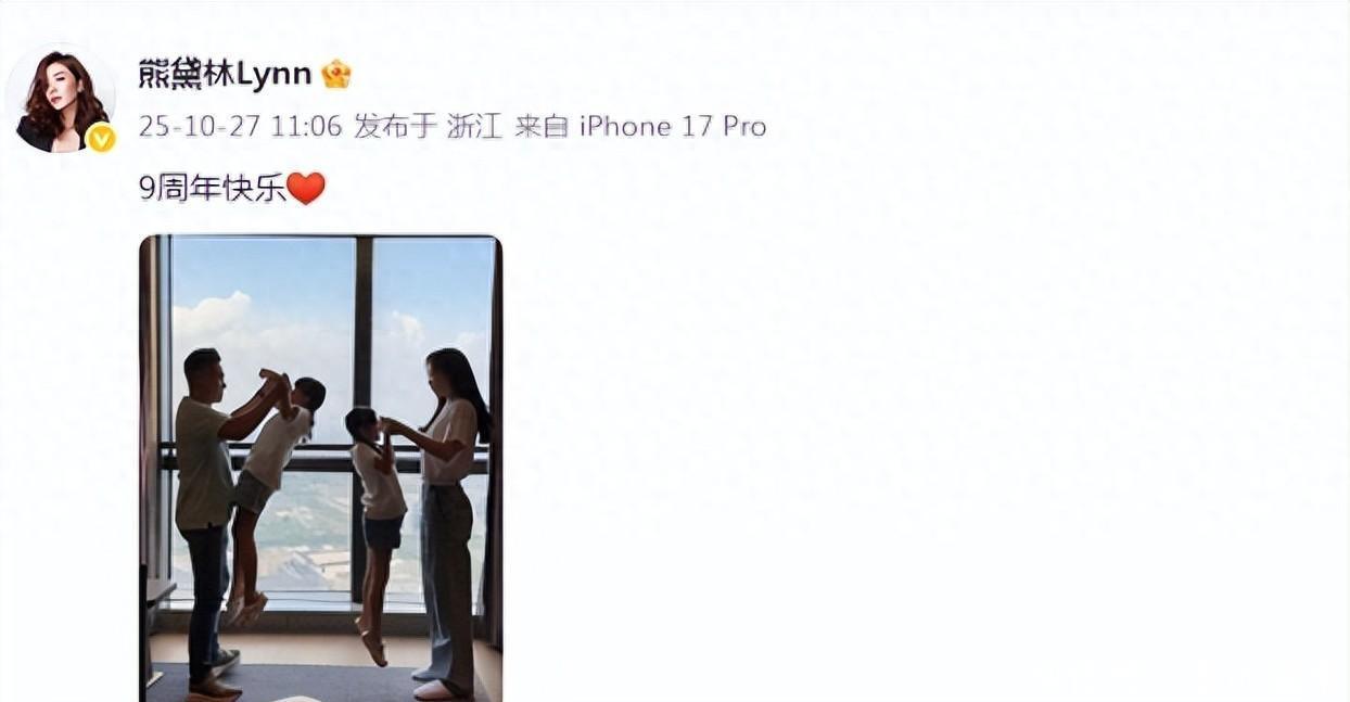 熊黛林庆祝结𸞍周年,一家四口幸福同框,双胞胎女儿全是小长腿       10 月 27 号那天,熊黛林在社交平台发了动态,庆祝和老公郭可颂结婚 9 周年,还晒了一家四口的全家福,全家凑一块儿庆祝,仪式感真的拉满了!她就写了句 “9 周年快乐”,末尾加的爱心表情,把那股幸福甜蜜劲儿全显出来了。       照片里他们一家都穿的亲子装,看着就特别有爱。熊黛林披着长发,穿白色短袖配牛仔裤,侧脸看着身材也太绝了,这曲线哪儿像生过俩孩子呀!看得出来这些年她在保养身材上花了不少心思,而且她还双手提着双胞胎姐姐,这辣妈臂力也太赞了吧。       姐姐小手紧紧抓着妈妈的手,扎着麻花辫笑得特开心,穿的短袖短裤把她的高个子衬得很明显,小长腿尤其亮眼。被爸爸提着的妹妹比姐姐还高点儿,这小长腿也超绝,看来俩宝贝都把妈妈的高个子基因和 “超模腿” 完美遗传到了。郭可颂提着小女儿,脸上表情特别温柔,一看就是个好爸爸。结婚九年了,俩女儿长大不少,夫妻俩还是跟以前一样甜,一家四口这样真的太有爱了。       前段时间熊黛林过 45 岁生日,也晒了不少庆生照,跟郭可颂的合影那叫一个甜。而且俩人现在夫妻相越来越明显了,郭可颂姐姐妹妹还有妈妈都来给她庆生,一大家子都疼她,幸福得不行。       之前熊黛林官宣和郭可颂结婚就挺受关注的,毕竟她前任是郭富城。可这么多年过去,他俩感情不仅没淡,反而更恩爱了,完全不像结婚九年的夫妻,甜到让人羡慕。现在他俩还是甜甜蜜蜜过小日子,双胞胎也慢慢长大,一家四口和和美美,真的甜到大家心里了。希望他们以后一直这么甜,俩宝贝也健康快乐长高高,一家永远幸福!       图片都是从网上找的。